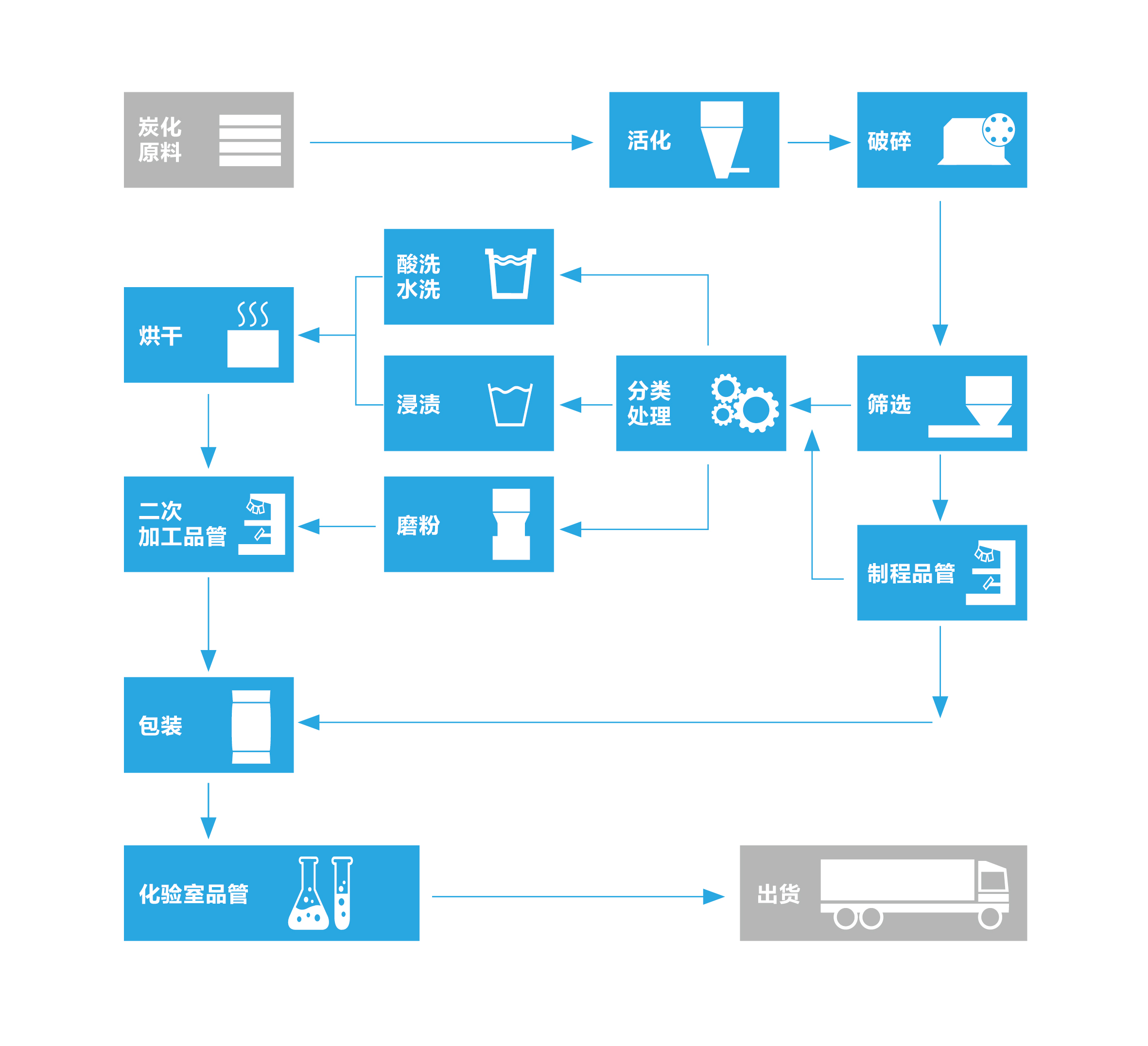 活性炭生產方法有兩種,化學活化法和物理活化法。 化學活化法就是通過將各種含碳原料與化學藥品均勻地混合后,一定溫度下,經歷炭化、活化、回收化學藥品、漂洗、烘干等過程制備活性炭。 物理法通常又稱氣體活化法,是將已炭化處理的原料在800 ~1000℃的高溫下與水蒸氣,煙道氣(水蒸氣、CO2、N2等的混合氣)、CO或空氣等活化氣體接觸,從而進行活化反應的過程。